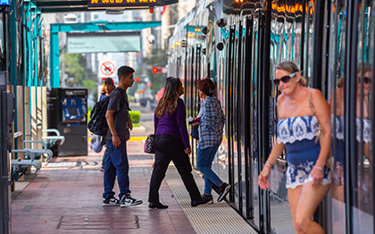 All METRORail platforms are accessible under the standards of the Americans with Disabilities Act (ADA). They offer sloped ramp access from both ends of the platform and level boarding that easily accommodates mobility devices.